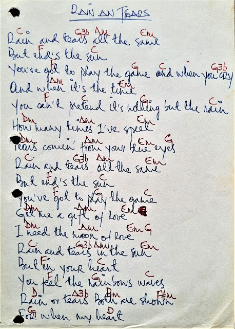 Damazio said he had a friend called Claudio who was a musician too and loved to sing in English. We ended up meeting up one day and I was really pleased to know a very good-looking young man who really enjoyed working with music and with the English language. He had never been abroad but he knew a lot of English. We sang a few songs together and he lent me some lyrics he had written on paper which I never gave back to him. A few years later, Damazio told me Claudio had an incurable disease something related to multiple sclerosis and was really sick. Not much later Claudio died. I was really sad to know such a beautiful creature had died. Here are 3 lyrics with Claudio's handwriting that I still cherish.